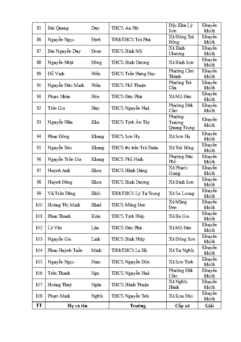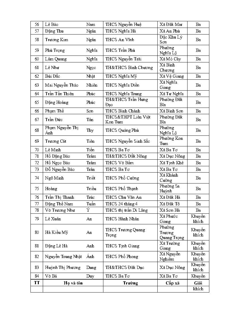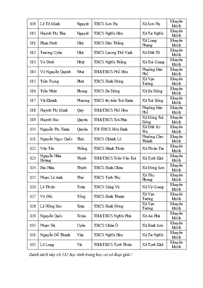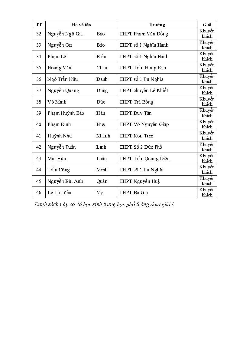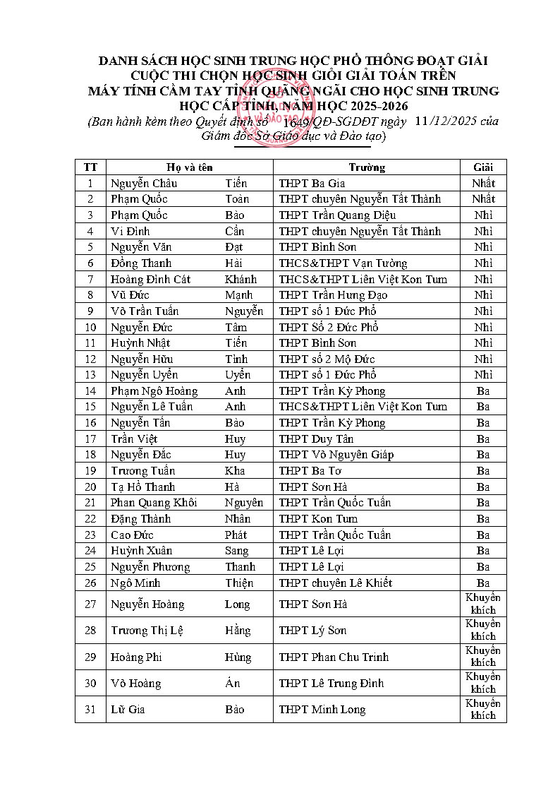 DANH SÁCH HỌC SINH ĐẠT GIẢI KỲ THI HỌC SINH GIỎI GIẢI TOÁN TRÊN MÁY TÍNH CẦM TAY TỈNH QUẢNG NGÃI NĂM HỌC 2025 - 2026